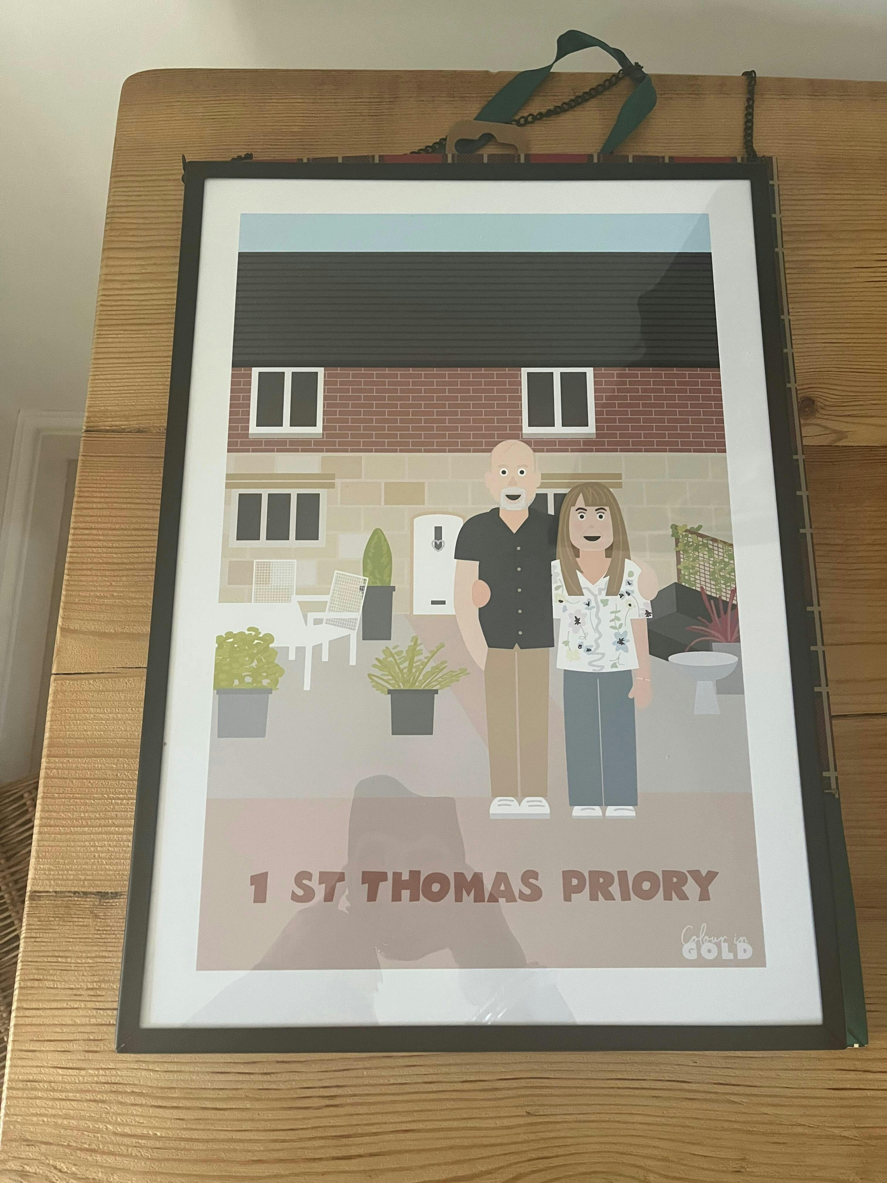 Working with Jo was a dream!! She happily accepted numerous photos of each member of the family in order to put us all together to create our portrait in front of our home. I loved the detail in the outfits we all wore and our characteristics. The whole thing is so clever and special. And she pulled out all the stops to get it ready, framed and delivered in time. She is brilliant. Highly recommend!!